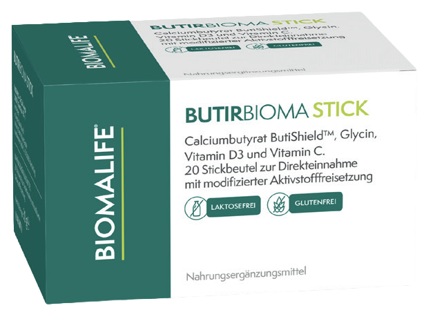 Nahrungsergänzungsmittel auf der Basis von Calciumbutyrat ButiShieldTM, Glycin, Vitamin D3 und Vitamin C. Stickbeutel zur Direkteinnahme mit modifizierter Aktivstofffreisetzung.